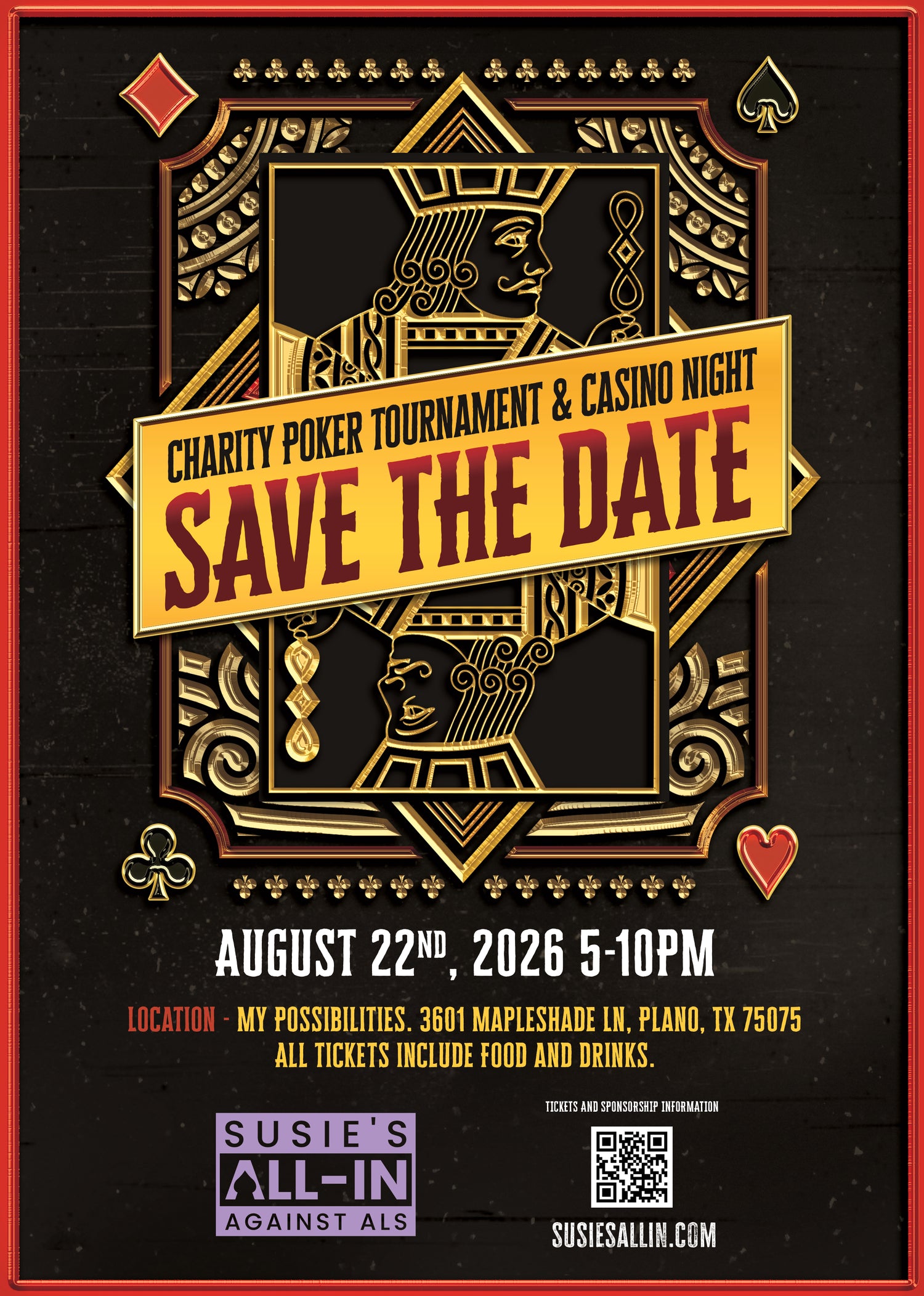 Our annual Charity Poker Tournament & Casino night is back August 22nd, 2026. We are back at My Possibilities in Plano. Be on the lookout for more info coming soon!